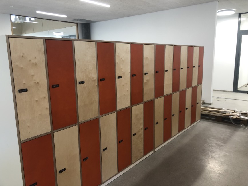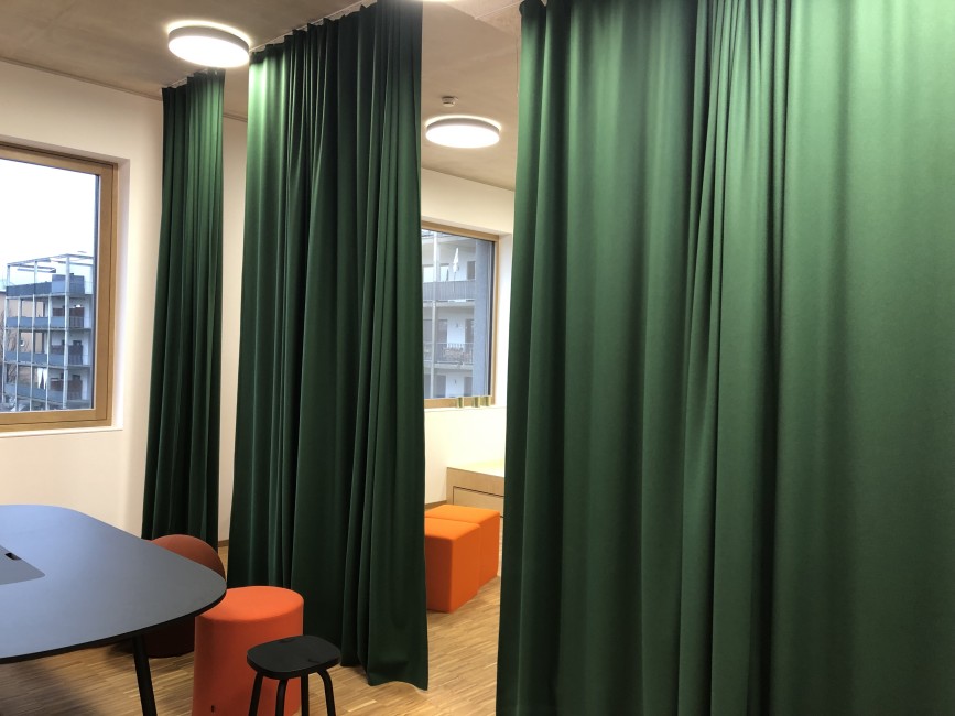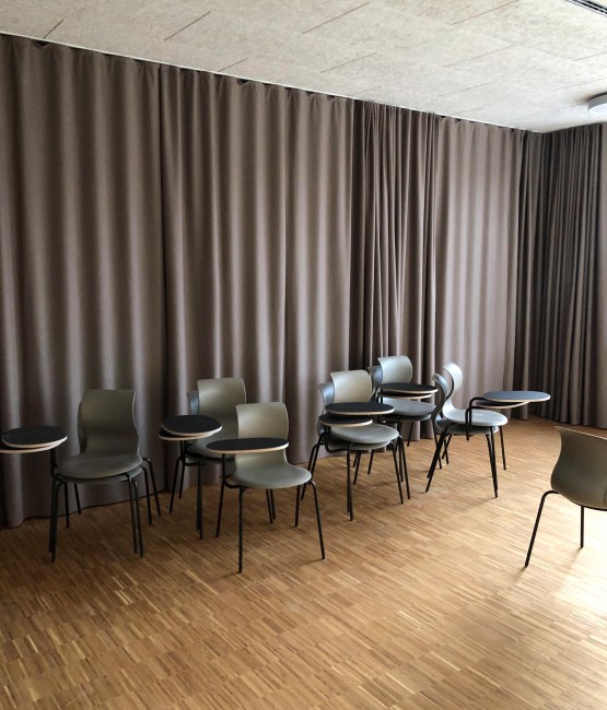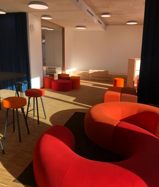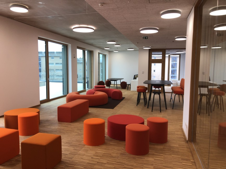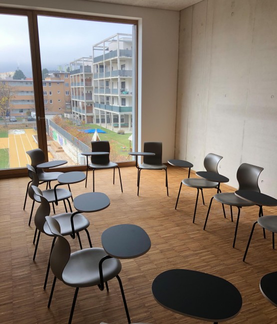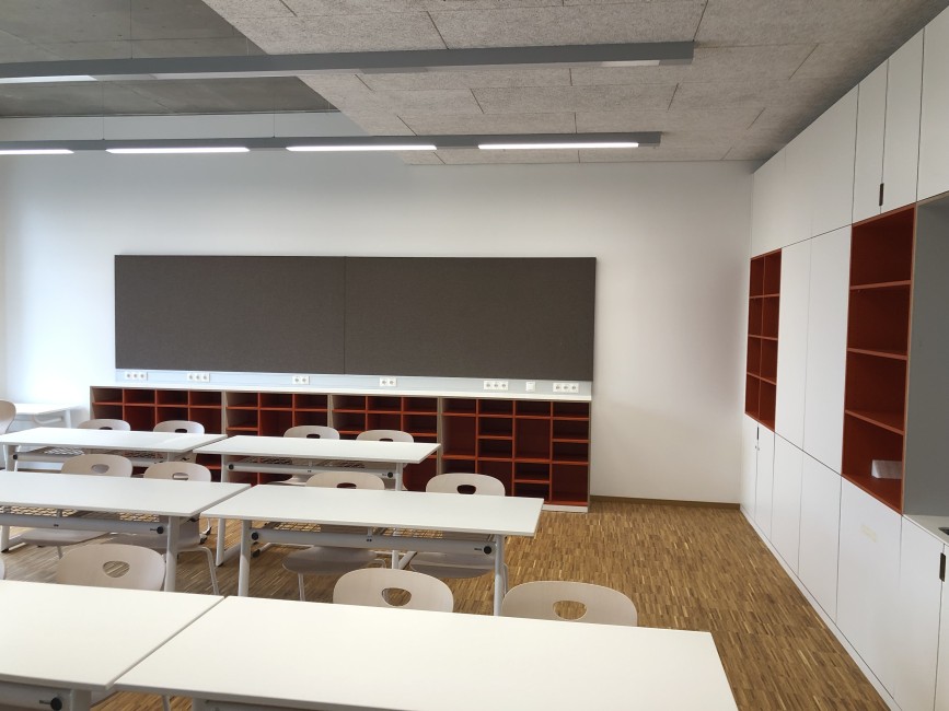 Auch die Klassen mit den angeschlossenen und farblich abgestimmten Marktplätzen, welche nach dem pädagogischen Prinzips des Future Classroom Labs entwickelt wurden, sind bereits möbliert und warten auf ihre zukünftige NutzerInnen.