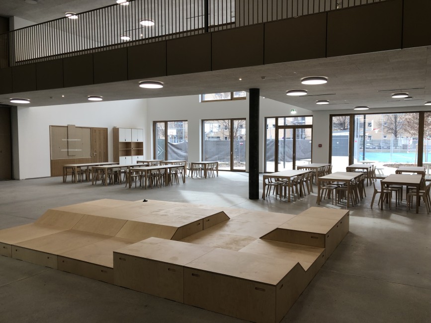 Das Erdgeschoss mit der grosszügigen und lichtdurchfluteten Schulhalle lässt bereits einen ersten Eindruck der zukünftigen Multifunktionalität erahnen.