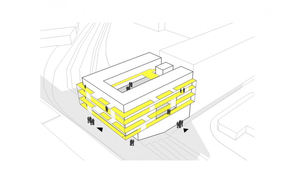 und bildet einen dynamischen Abschluss an der Straße, der vom Panoramaweg und der gegenüberliegenden Böschungskante ein deutliches Zeichen setzt. Die vorhandenen unterschiedlichen Niveaus werden vom Neubau aufgegriffen. Es gibt zwei Zugänge; einen von der Straße ins Erdgeschoss und einen weiteren vom Panoramaweg für Kindergarten und Schule. Über beide Zugänge erreicht man den zentralen atriumartigen Erschließungsturm. Der Baukörper hilft die Geländeniveaus zu überwinden und bildet auf alle drei Seiten attraktive Gebäudefronten. Straßenseitig das Restaurant mit eigenem Freibereich am großzügigen urbanen Vorplatz an der Richard-Schöps- Gasse, welcher sich mittels Terrassierung und Sitzmöglichkeiten über die Böschung bis an den Panoramaweg erstreckt. Von hier erfolgt auch die Anlieferung und Entsorgung. Südseitig am Panoramaweg entsteht am Eingang in den Kindergarten und Schule der Panoramaplatz. Dieser bietet eine überdachte Wartesituation für Eltern, Kinder und alle Passanten mit barrierefreiemr Verbindung zur Urschenböckstrasse. An der Südwestseite ergibt sich ein vielseitiger KinderGarten mit der vorhandenen Böschung, welche durch Sitzstufen und eine Rutsche ins Zentrum der kindgerechten Aktivitäten rutscht. Der zentrale Erschließungsturm verbindet die unteren fünf Geschosse und stellt in großzügiger Weise eine vertikale Verbindung, aber auch Austausch und Sichtbeziehungen zwischen den Geschossen her. Durch die Gestaltung werden Orientierung Begegnung und Flexibilität erleichtert. Der Raum ist nicht nur Weg sondern identitätsstiftender Aufenthaltsraum. In beiden oberen Geschossen sind die Wohnungen vorgesehen, die um einen geschützten Wohnhof organisiert sind. Der Hof mit der Zweigeschoßigkeit soll einen beschützten und familiären Charakter erhalten. Damit entsteht neben den privaten Außenbereichen ein Gemeinschaftshof für die Anwohner für vielfältige Nutzungen; besonders für Familien soll dieser eine große Bereicherung sein. Die Schlafzimmer sämtlicher Wohnungen sind nach außen orientiert. Alle Wohnungen ist ein privater Aussenbereich zugeordnet.