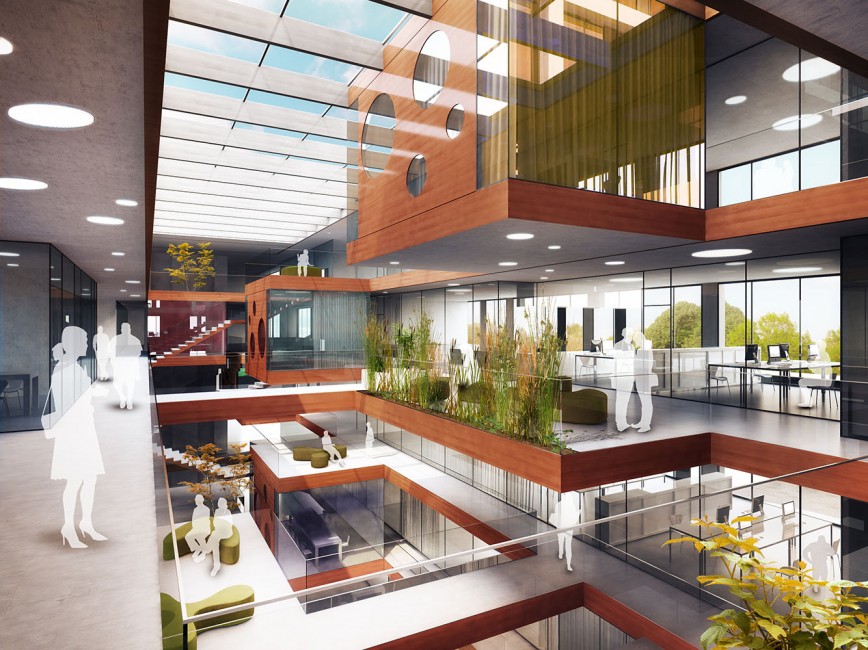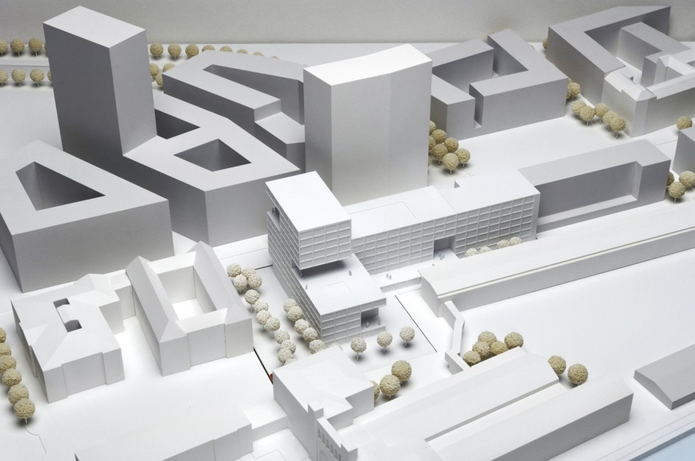 Die städtebauliche Baukörperkomposition, im Wesentlichen zusammengesetzt aus der verschiedenen Volumen –Hochhaus-Riegel- Kubus- reagiert auf die verschiedenen Gegebenheiten der direkten Umgebung.