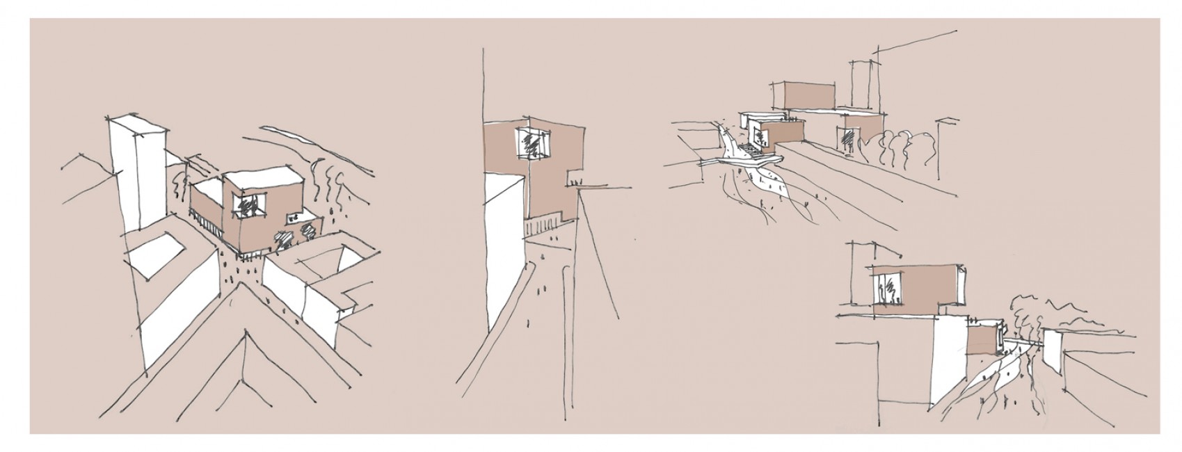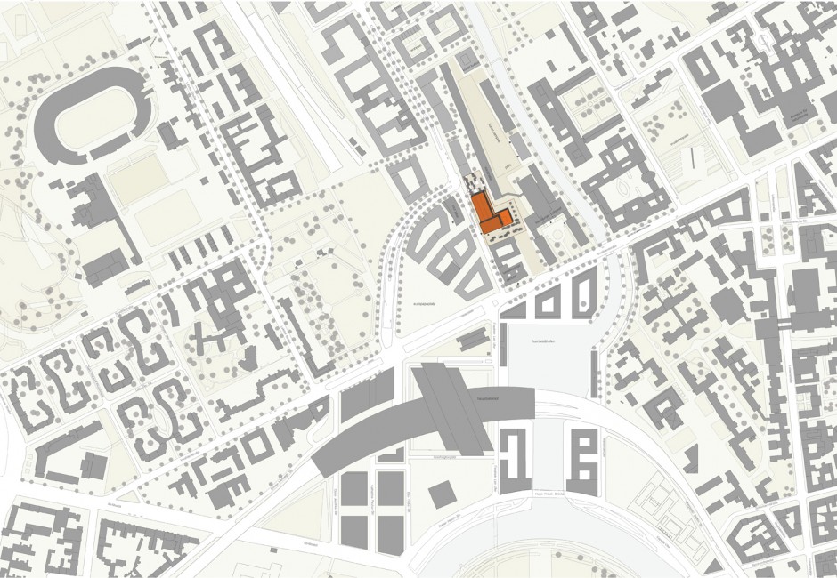 Die Position des Neubaus, an einer Schlüsselstelle zwischen Bahnhof, Eurocity, Heidestrasse; Kultur und Freizeit, führt die verschiedenen Strukturen zusammen.