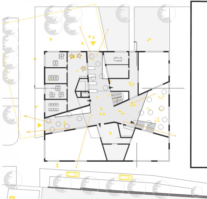 Als Reaktion auf die heterogene Organisation des bestehenden Sportzentrums soll der Neubau der Schule ein sichtbares städtebauliches und außenräumliches Zeichen entlang der Straßen- und Eingangsseite setzen.