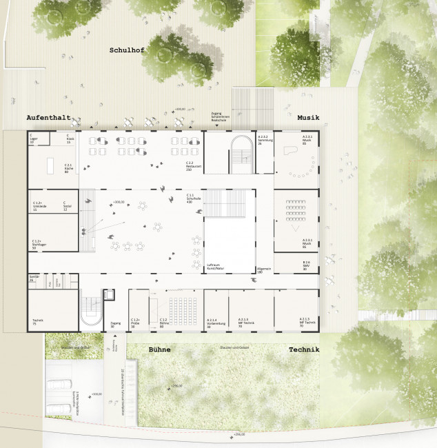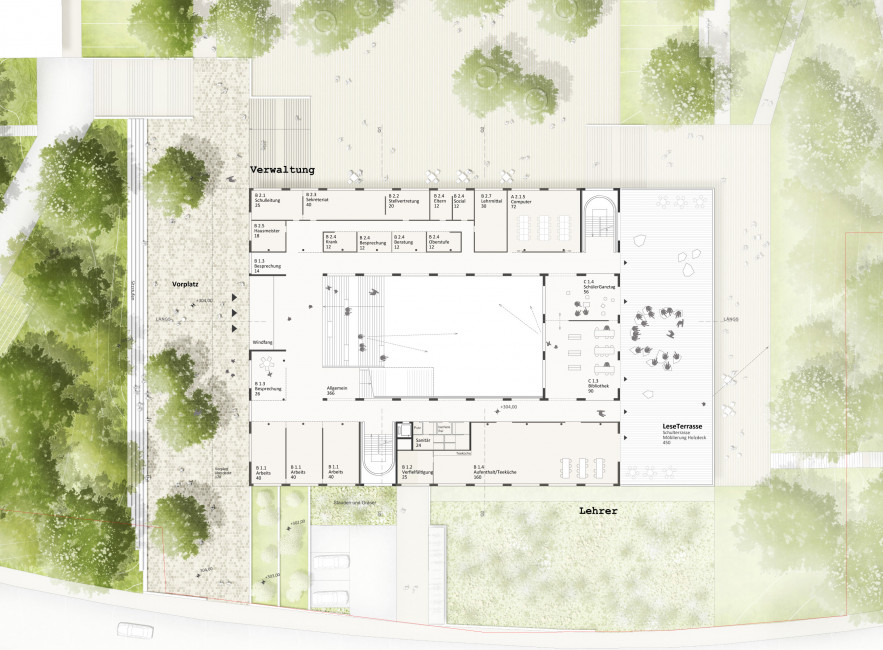 Gemeinsam mit der Realschule, den beiden Sporthallen und dem Klassentrakt entsteht um den neuen Schulplatz die kreisförmig angeordneten Bildungsbauten zu einem neuen Bildungscluster. Ergänzt wird der neue Bildungscluster durch den früheren Musiktrakt, der zukünftig der Schule im Sinne der Nachhaltigkeit als Ergänzungsfläche zur Verfügung steht; zum Beispiel den OberstufenschülerInnen als Treffpunkt und Arbeitsraum.