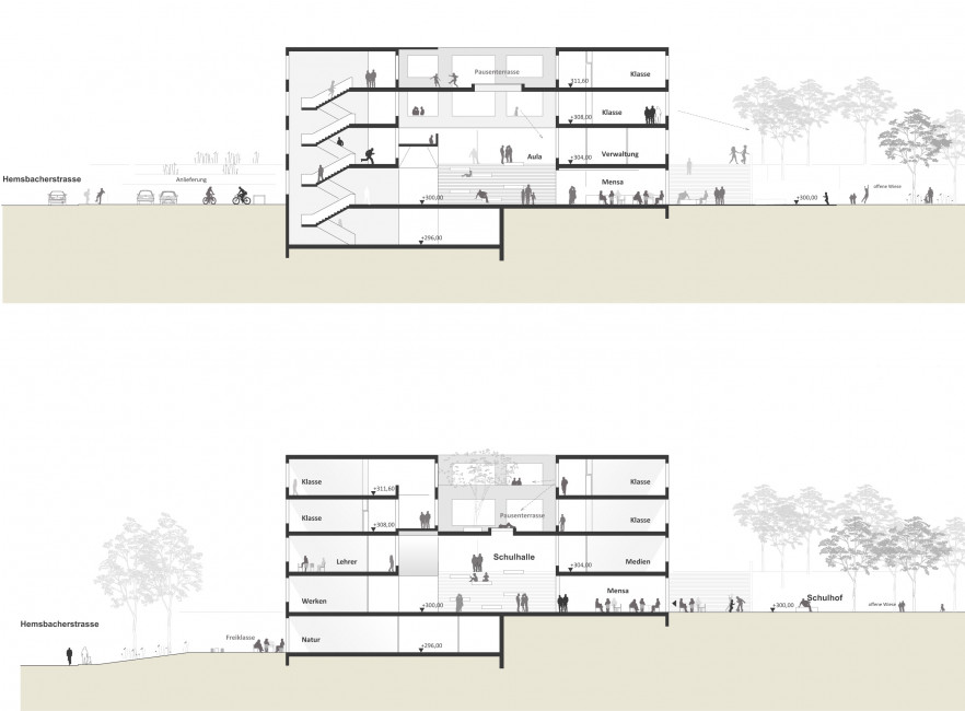Der kompakte Baukörper des Gymnasiums setzt ein klares städtebauliches und architektonisches Zeichen und gliedert die umgebenden Aussenräume in gut nutzbare mit der Innennutzung abgestimmte Freiflächen. Wie auch die Realschule wird das Gymnasium über die Hemsbacherstrasse erschlossen.