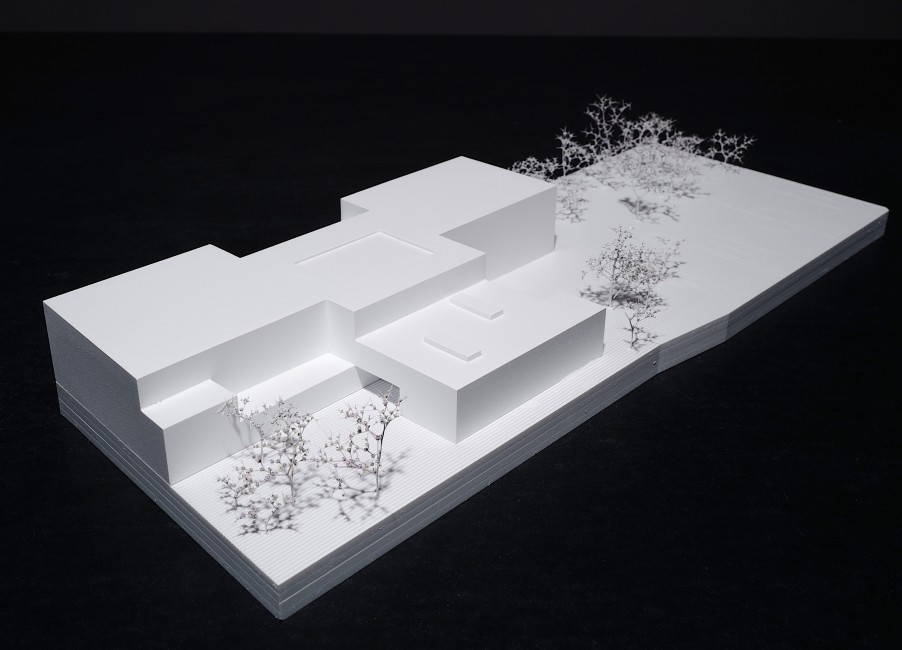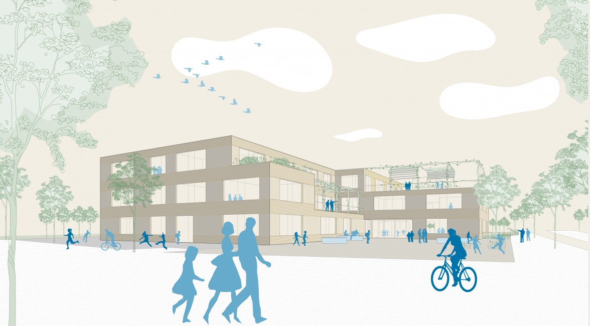 Zum Schulplatz zugewandt entsteht der grosszügige Vorplatz der Volksschule, als Platz zum Ankommen und Treffen. An der Ostseite zum Sportplatz verfügt der Baukörper über eine geschlossene Fassade mit nur punktuellen Durchbrechungen. Hier befindet sich die grosszügige Leseterrase, eine für die Gemeinschaft zugängliche Freifläche mit offenen Bücherschränken und Sitzmöglichkeiten (auch wenn die Schule geschlossen ist). An der Süd- und Ostseite staffelt sich der Baukörper zu den Grünflächen ab und es entstehen selbstständige und identitätsstiftende Innen- und Aussenräume.